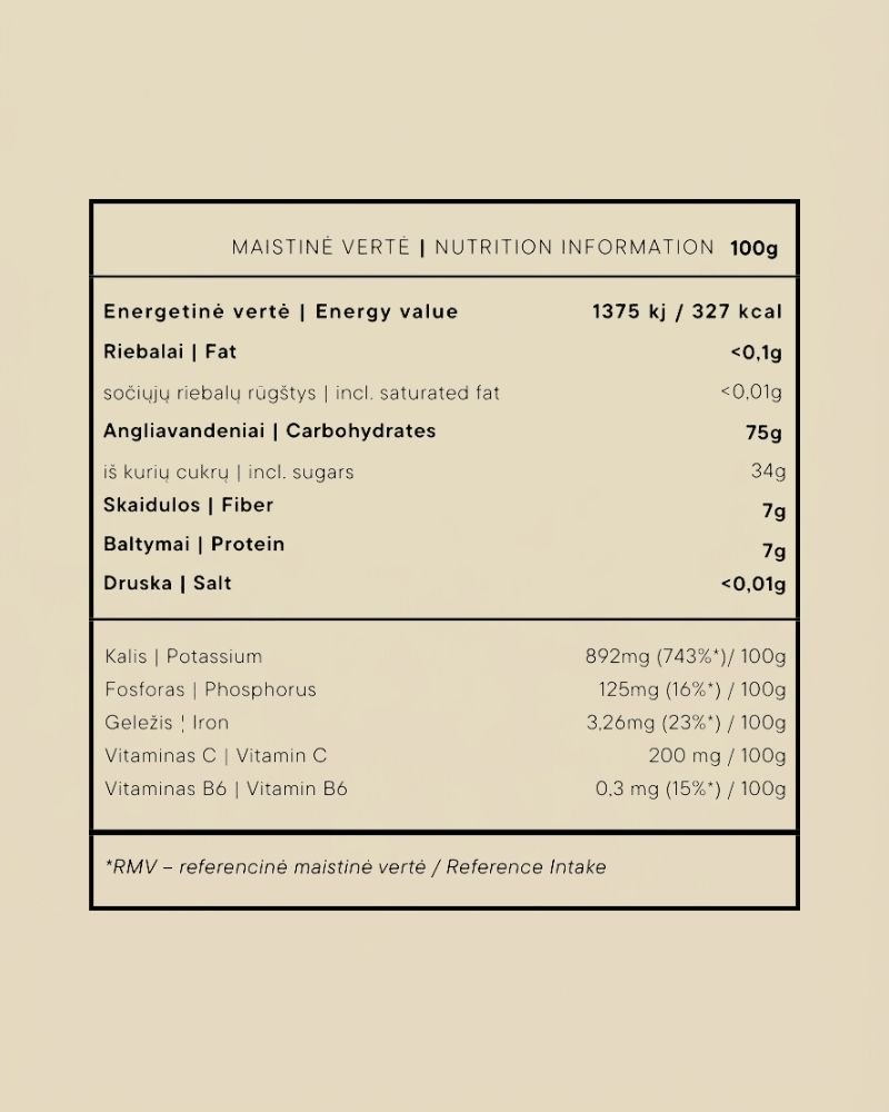 - Natūralus vitamino C šaltinis — 200 mg / 100 g.